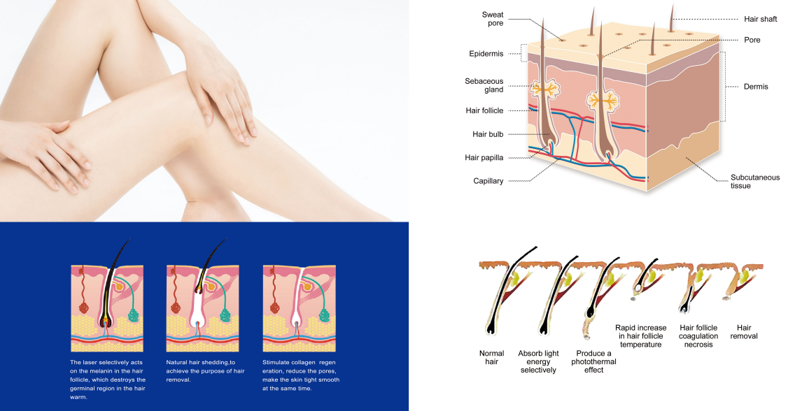 Basée sur le principe de la photothermolyse sélective, l'épilation laser agit sur l'ensemble de la structure du poil, de la tige pilaire au follicule. L'énergie lumineuse d'une longueur d'onde spécifique de 808 nm est absorbée par la mélanine chromosphérique endogène, ce qui entraîne un échauffement rapide et une nécrose thermique locale des structures régénératrices des follicules.